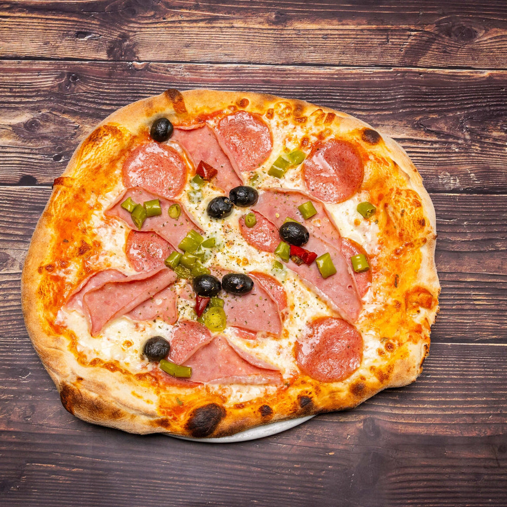 scharf, mit Schinken, Salami, Pfefferoni, Oliven